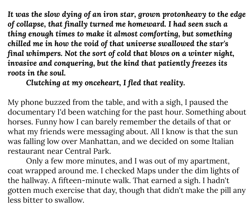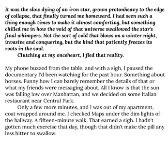How could you ever know how it is to have a universe roiling around you—in you? Tearing you apart limb by atom, while not giving you the courtesy to scream? Humbly presenting love and laughter with its back turned to you?